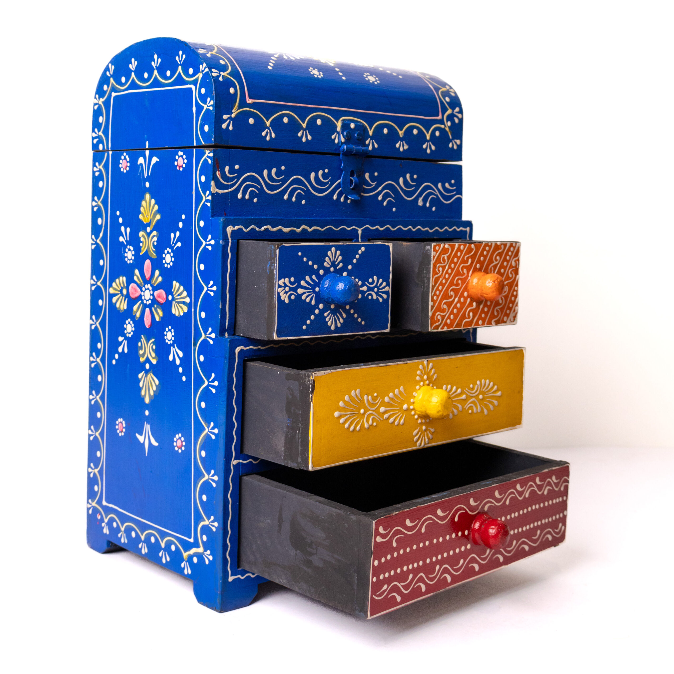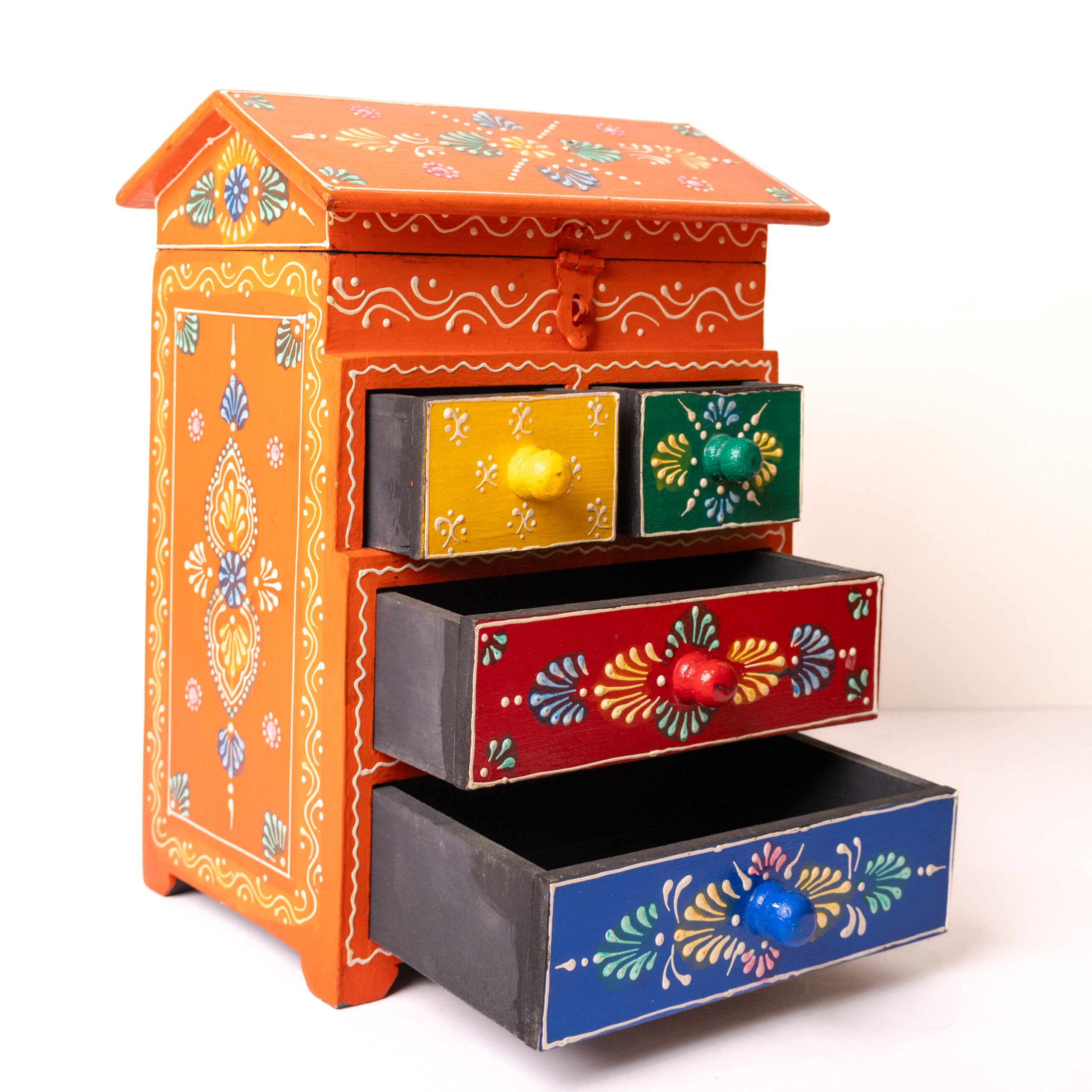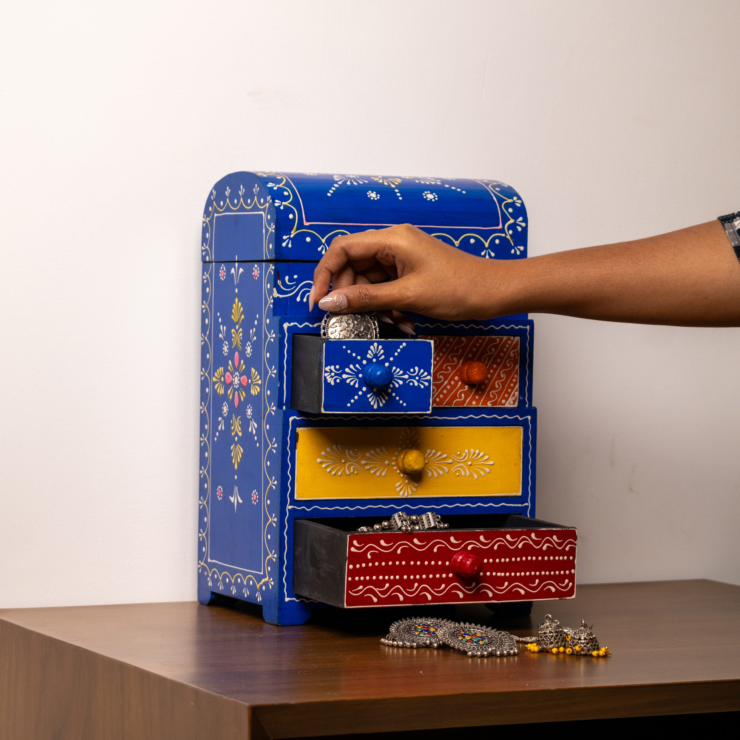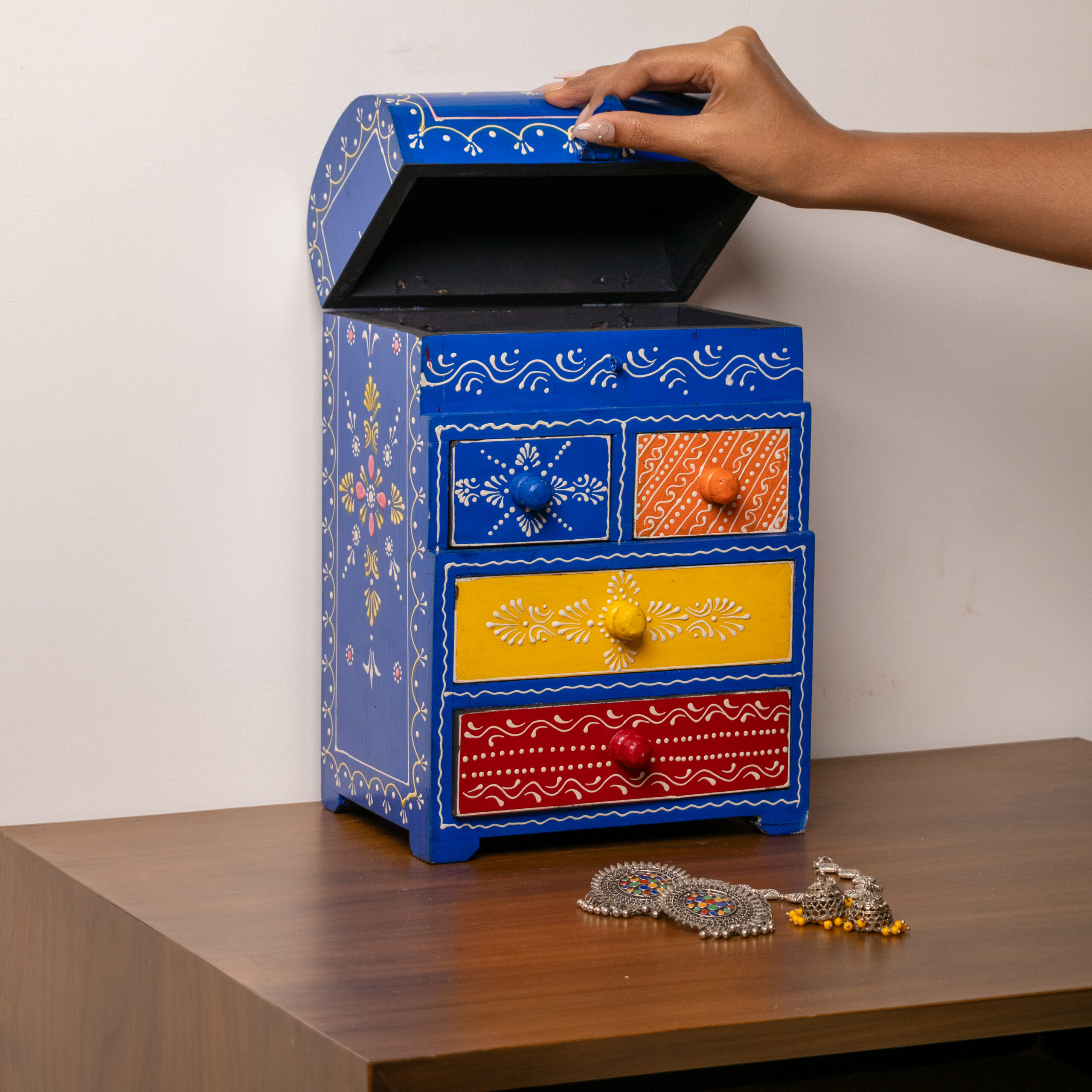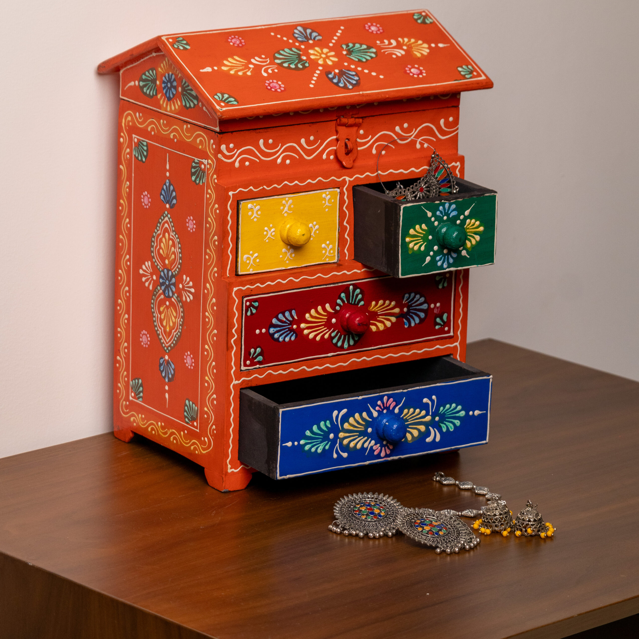 Bring color and organization to your dressing space with this beautiful Hand-Painted Wooden Jewellery Organizer – combining vibrant artistry with practical storage in one stunning piece.